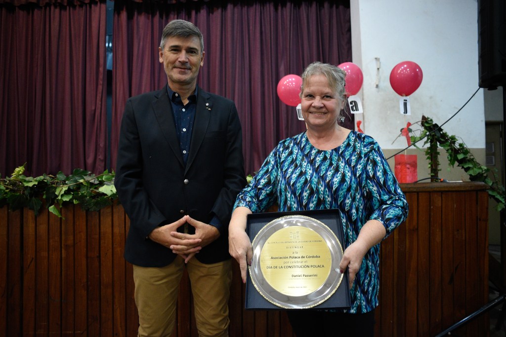 Durante el acto protocolar, el viceintendente hizo entrega a Susana Lancman, presidente de la Asociación Polaca de Córdoba, una placa conmemorativa por el Día de la Constitución Polaca.