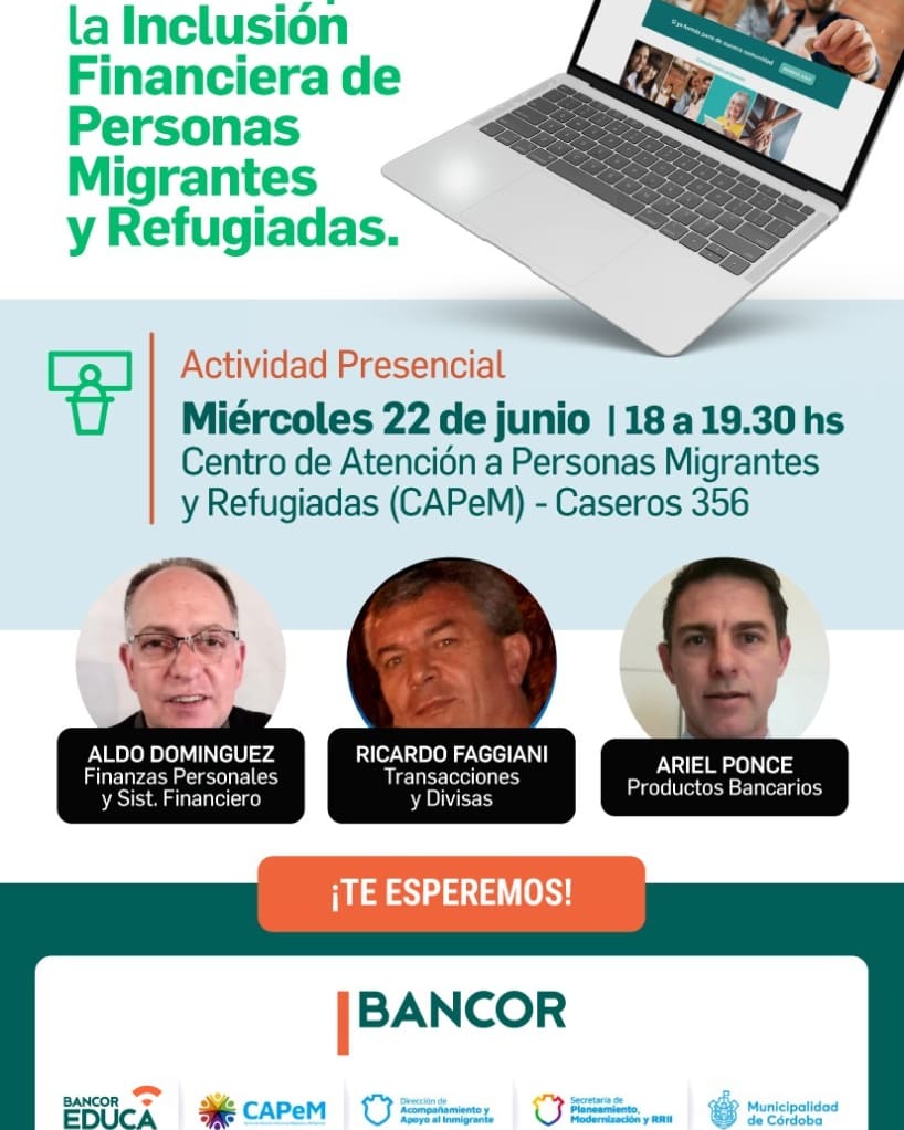 Desde el Centro de Atención a Personas Migrantes y Refugiadas – CAPeM- de la Municipalidad de Córdoba junto al Banco de Córdoba te invitan a esta actividad presencial a realizarse el 22 de junio de 18 a 19:30 hs.