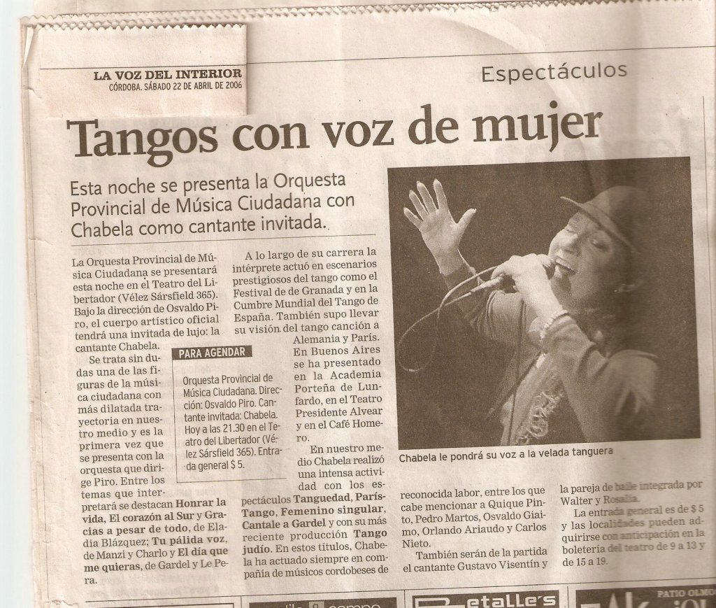 Para conocer su recorrido y presentaciones en los distintos escenarios de Argentina y el mundo ingresar a su blog: http://chabelatango.blogspot.com/