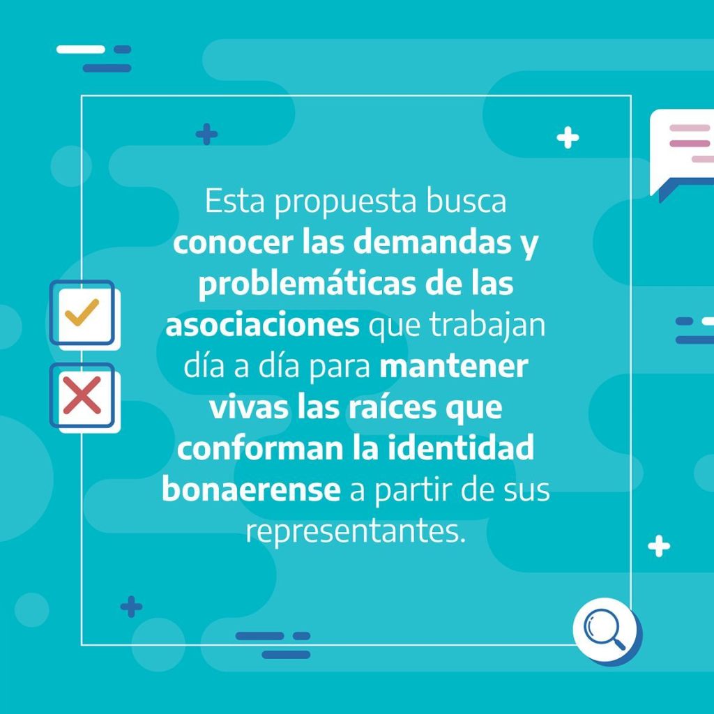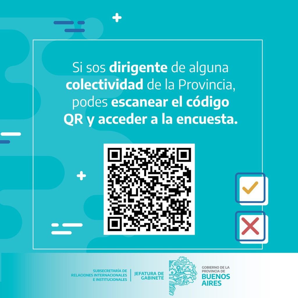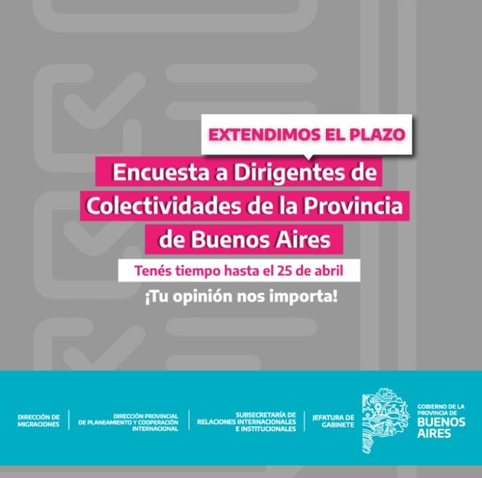 Hasta el 25 de abril, está disponible la Encuesta a Dirigentes de Colectividades de la Provincia de Buenos Aires. La consulta es una iniciativa de la Dirección de Migraciones y Colectividades junto con Buenos Aires Cultura y busca conocer, a partir de sus representantes, las demandas y problemáticas de las asociaciones que trabajan día a día para mantener vivas las raíces que conforman la identidad bonaerense.