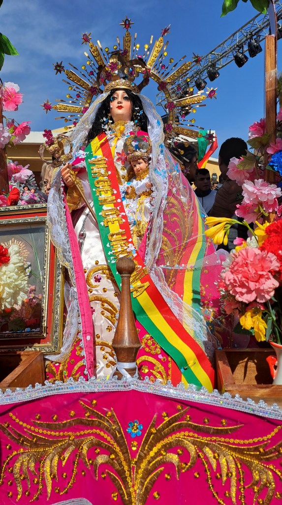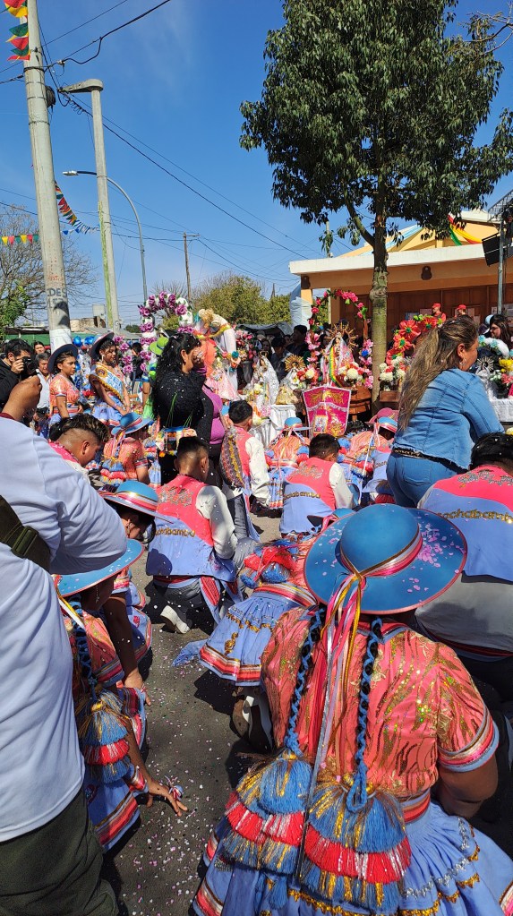 En sus inicios, tenían a la Virgen en un cuadrito y con ella empezaron a hacer la misa. El primer año se realizó en la parroquia de barrio Las Flores y, al año siguiente, en la de Villa El Libertador, donde continúan hasta hoy. También nos contó que fue su esposo quien trajo la imagen de la Virgen de Bolivia y, a partir de entonces, es la que precede la procesión por ser la más grande.