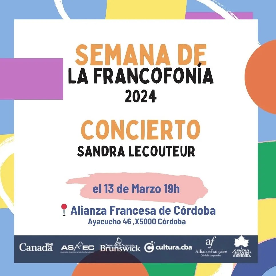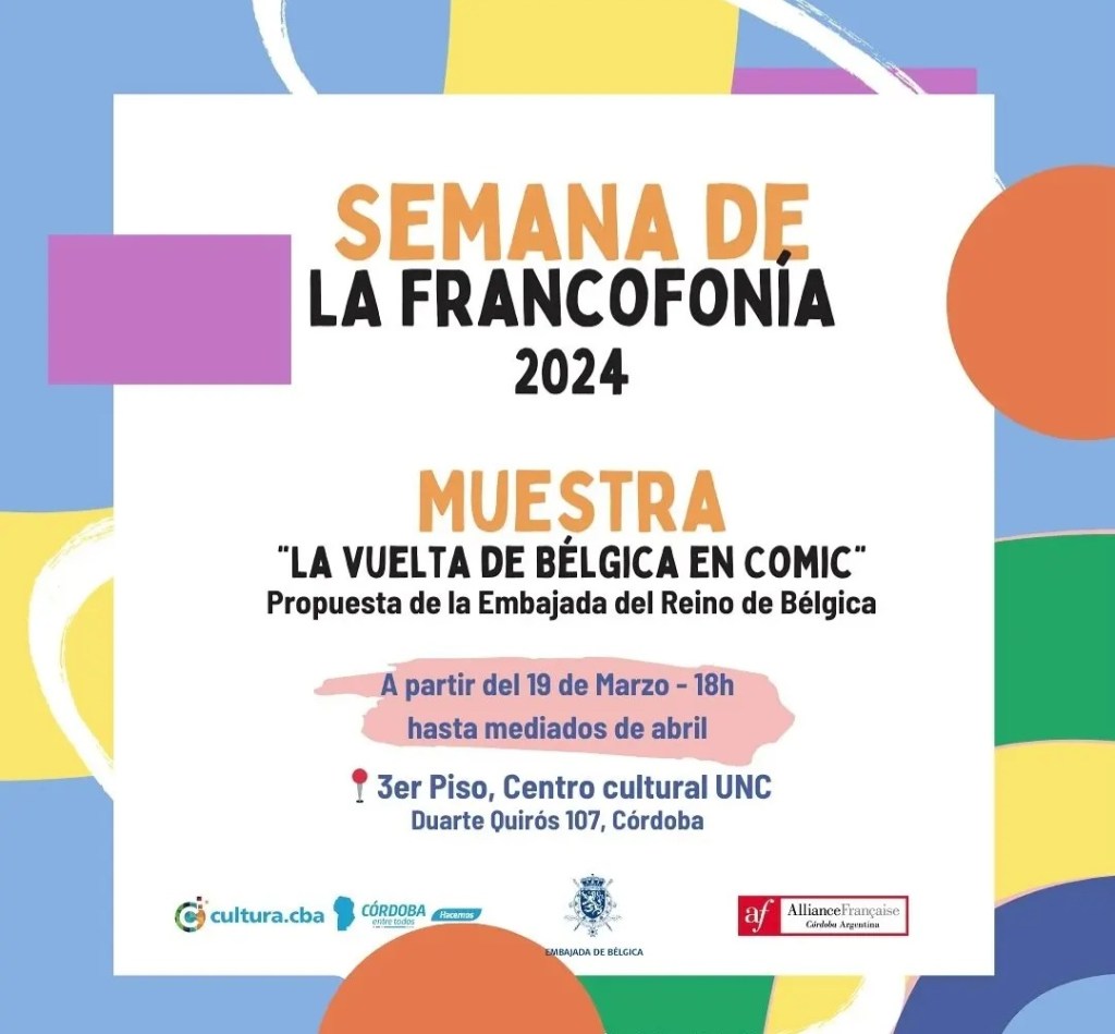 En Córdoba se celebra la semana de la Francofonía del 13 al 21 de marzo en colaboración con Cultura Córdoba, la Embajada de Bélgica, el Centro Cultural Canadá Córdoba, la Casa Suiza, la Escuela de Letras, la Facultad de Filosofía y Humanidades de la Universidad Nacional de Córdoba, el Teatro Cochera y la Sociedad Sirio Libanesa de Córdoba. Será una oportunidad para afianzar la conexión común con el idioma francés y nuestros valores compartidos.