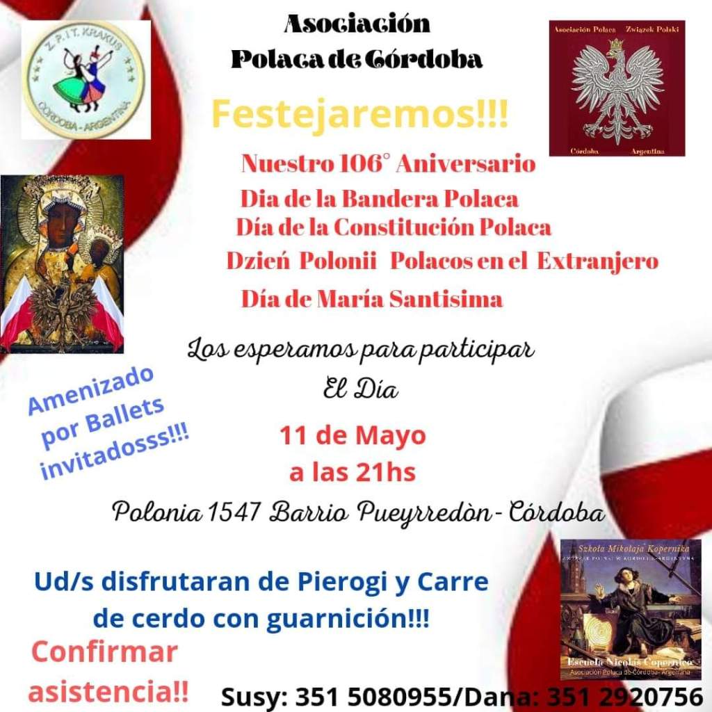 🇵🇱 La Asociación Polaca de Córdoba anunció una serie de celebraciones que tendrán lugar el sábado 11 de mayo a las 21 hs en su sede ubicada en la calle Polonia 1547, en el barrio Pueyrredón de Córdoba.