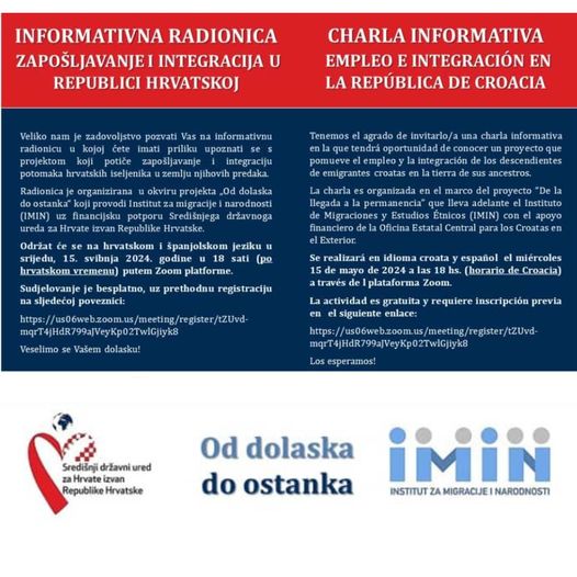 El Instituto de Migraciones y Estudios Étnicos (IMIN) te invita cordialmente a una charla informativa sobre el proyecto «De la llegada a la permanencia», que busca promover el empleo y la integración de esta comunidad en Croacia. ![]()