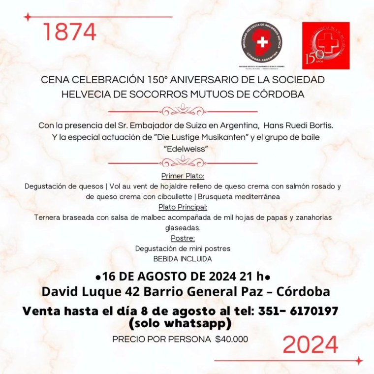 El evento, que se llevará a cabo el próximo 16 de agosto a las 21 horas en David Luque 42, Barrio General Paz, contará con la presencia del Sr. Embajador de Suiza en Argentina, Hans Ruedi Bortis, y ofrecerá un espectáculo artístico a cargo de «Lustige Musikanten» y el grupo de baile «Edelweiss».