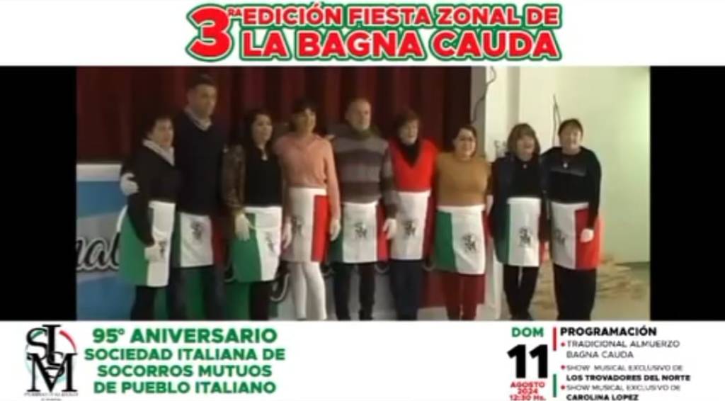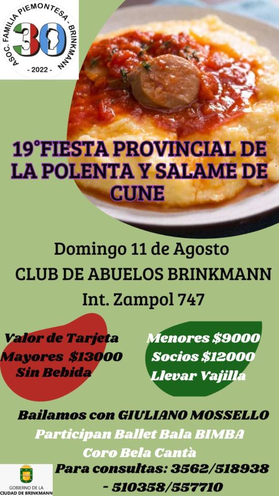 - 11 de agosto: Pueblo Italiano festejará los 95 años de su Sociedad Italiana, Brinkmann realizará la 19° Fiesta Provincial de la Polenta y Salame de Cune, y en Córdoba, la Asociación Familia Siciliana celebrará la Fiesta de San Sebastián.