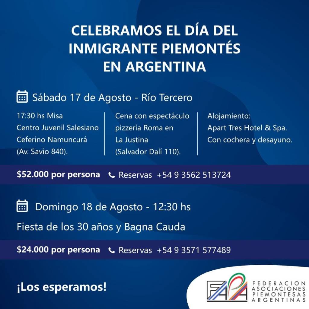 - 17 de agosto: Río Tercero homenajeará a los inmigrantes piamonteses en Argentina, y Colonia Caroya se sumergirá en la Fiesta de las Comidas Típicas Caroyenses.