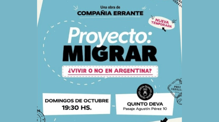 Tras el éxito de su primera temporada, con localidades agotadas en todas sus funciones, «Proyecto Migrar» vuelve a presentarse los domingos de octubre a las 19:30 hs. en la sala Quinto Deva (pje. Agustín Pérez 10). Esta vez, la obra se concentra en una sola sala, pero mantiene la esencia de su propuesta original, que invitaba al público a moverse entre dos espacios simultáneos para vivir una experiencia teatral única.