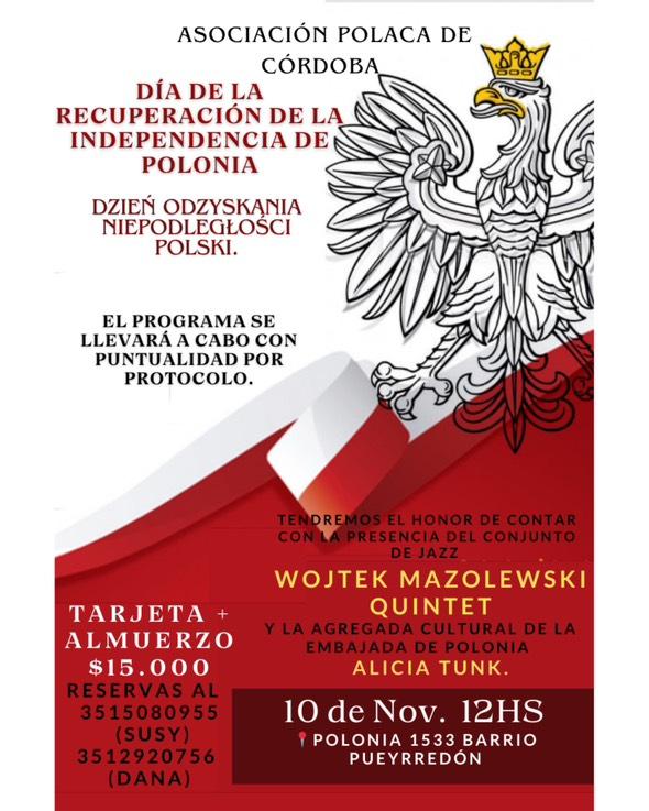 Córdoba se prepara para celebrar un nuevo aniversario de la Recuperación de la Independencia de Polonia. La Asociación Polaca de Córdoba te invita a sumarte a este festejo el domingo 10 de noviembre a las 12:00 hs. en su sede ubicada en Polonia 1533, Barrio Pueyrredón.