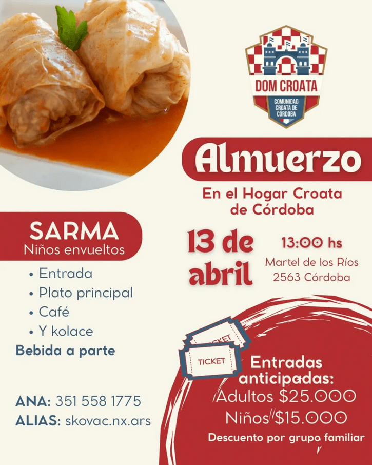 El Hogar Croata de Córdoba (@hogarcroatadecordoba) se prepara para recibir a la comunidad con un almuerzo que promete transportar a los comensales a los sabores de Croacia. El evento se llevará a cabo el sábado 13 de abril a las 13:00 horas en las instalaciones de la institución, ubicada en Martel de los Ríos 2563.