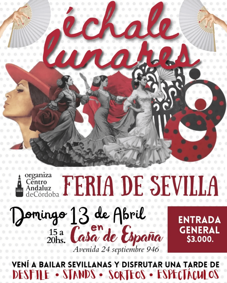 El Centro Andaluz de Córdoba (@centroandaluzcba) convoca a una nueva edición de su tradicional Feria de Sevillanas. El evento se llevará a cabo este domingo 13 de abril, de 15:00 a 20:00 horas, en las instalaciones de Casa de España, ubicada en Avenida 24 de Septiembre 946, en barrio General Paz de la ciudad de Córdoba.