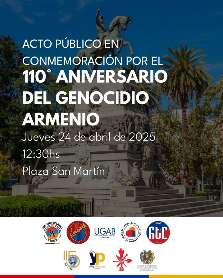El próximo jueves 24 de abril, a las 12:30 horas, la comunidad armenia de Córdoba se reunirá en la Plaza San Martín para conmemorar el 110° aniversario del Genocidio Armenio.