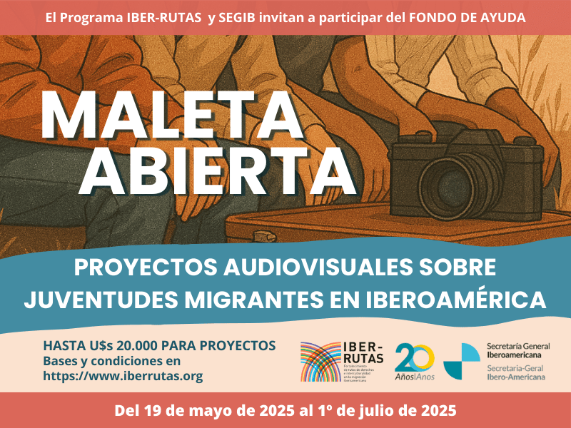 Desde el 19 de mayo hasta el 1 de julio de 2025, el Programa IBER-RUTAS, junto con la Secretaría General Iberoamericana (SEGIB), invitan a participar en el Concurso Internacional Fondo de Ayuda Maleta Abierta 2025. Esta convocatoria busca estimular y visibilizar producciones audiovisuales que aborden las experiencias y miradas de las juventudes migrantes en Iberoamérica, promoviendo la diversidad cultural y sensibilizando sobre la temática migratoria.