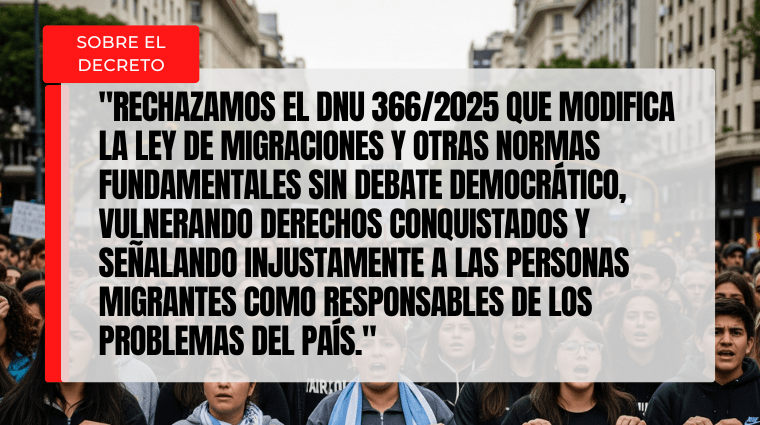 Diversas organizaciones de migrantes, de derechos humanos, académicas y de la sociedad civil han expresado su rotundo rechazo al Decreto de Necesidad y Urgencia (DNU) 366/2025, que modifica la Ley de Migraciones y otras normativas fundamentales en Argentina. En un comunicado conjunto, las entidades firmantes denuncian que la medida vulnera derechos conquistados y «señala injustamente a las personas migrantes como responsables de los problemas del país».