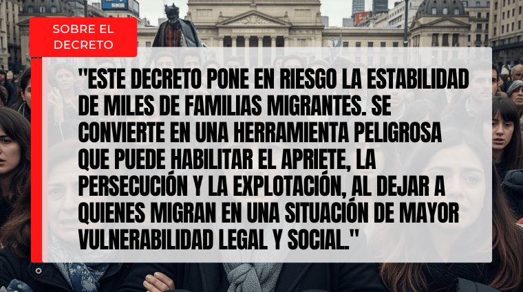 El decreto «pone en riesgo la estabilidad de miles de familias migrantes» y se convierte en una «herramienta peligrosa que puede habilitar el apriete, la persecución y la explotación».