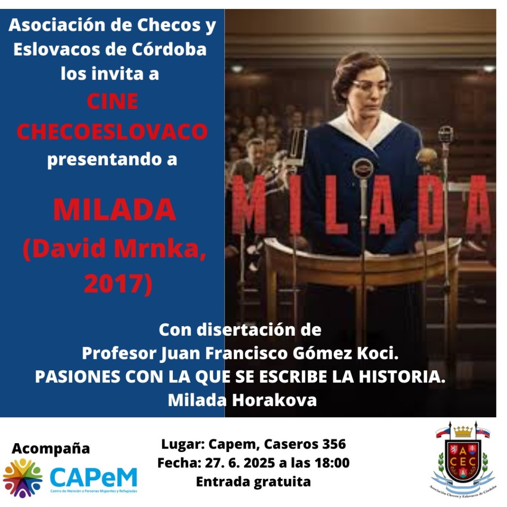 La Asociación de Checos y Eslovacos de Córdoba (@checosyeslovacoscba) ha organizado un nuevo Ciclo de Cine Checoslovaco, abierto tanto al público general como a los miembros de la colectividad. La próxima cita será el 27 de junio, a las 18 horas, con la proyección de la película «Milada» (David Mrnka, 2017).