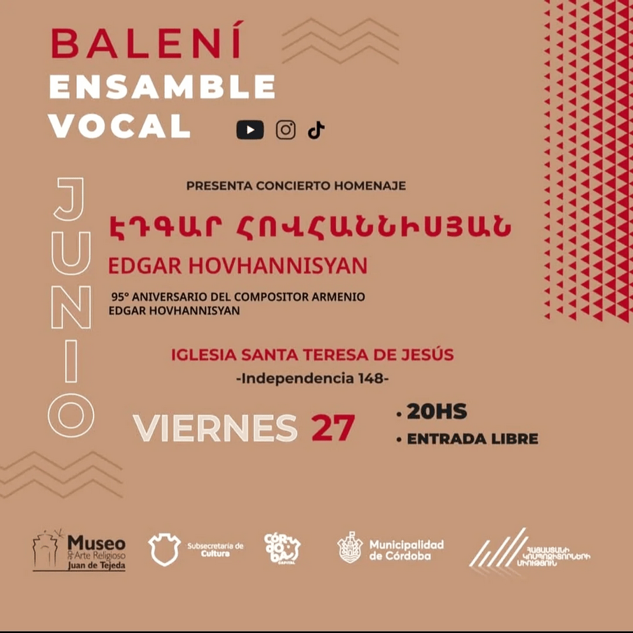 El ensamble vocal Balení se prepara para un emotivo concierto homenaje al reconocido compositor armenio Edgar Hovhannisyan, en el marco de la celebración de su 95° aniversario. El evento, que promete ser una cita imperdible para los amantes de la música, se llevará a cabo el viernes 27 de junio a las 20:00 hs en la Iglesia Santa Teresa de Jesús, ubicada en Independencia 148, en la ciudad de Córdoba. La entrada será libre y gratuita.