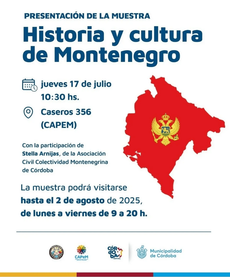 Desde el 14 de julio y hasta el 2 de agosto, el Centro de Atención a Personas Migrantes y Refugiadas (CAPeM) de la Municipalidad de Córdoba, junto a la Colectividad Montenegrina de Córdoba, presentan la muestra “Historia y Cultura de Montenegro”. Esta iniciativa busca poner en valor la memoria, las tradiciones y la identidad de este país europeo, ofreciendo un acercamiento profundo a su rico patrimonio.