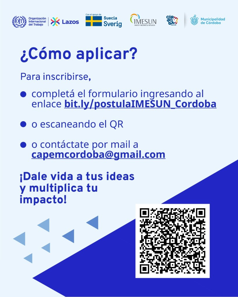 Las interesadas pueden postularse a través del enlace bit.ly/postulaIMESUN_Cordoba o contactarse vía correo electrónico a capemcordoba@gmail.com. Esta propuesta es el resultado de una colaboración entre la Municipalidad de Córdoba, la Organización Internacional del Trabajo (OIT), Fundación Lazos, Suecia e IMESUN, con el objetivo de construir una Córdoba más conectada, integrada y humanizada.