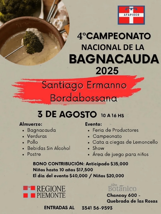 La Asociación Familia Piemontesa de Córdoba (AFAPIECO) organiza la cuarta edición del Campeonato Nacional de la Bagna Cauda, un evento que celebra la gastronomía piamontesa.