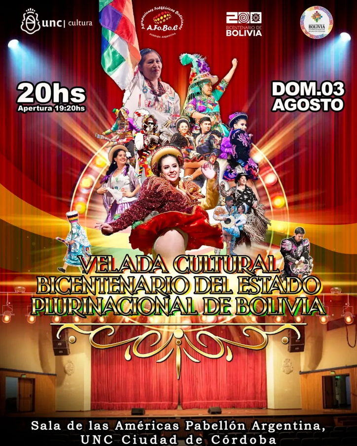Córdoba se prepara para una nueva edición de la Velada Cultural en conmemoración del Bicentenario del Estado Plurinacional de Bolivia. El evento, que ya es un clásico en la ciudad, tendrá lugar el domingo 3 de agosto a las 20:00 horas en la Sala de las Américas, ubicada en el Pabellón Argentina de la Ciudad Universitaria.