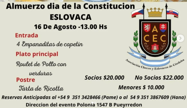 La Asociación Checos y Eslovacos de Córdoba (ACEC) invita a celebrar el Día de la Constitución Eslovaca el sábado 16 de agosto a las 13 horas. El evento, que se realizará en el Club Polaco (Polonia 1547), contará con un almuerzo con platos típicos y la actuación musical del grupo «Vesmír», que viajará desde Buenos Aires.