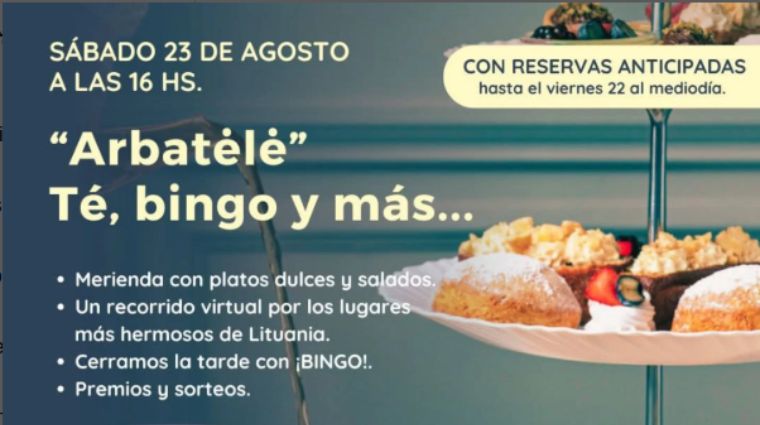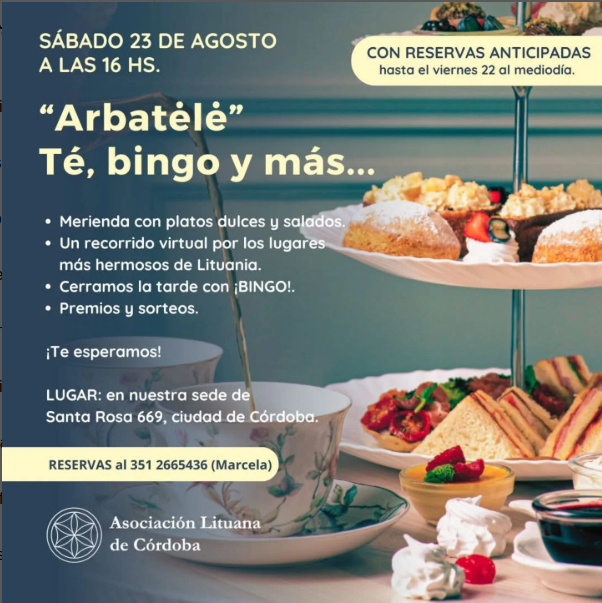 La Asociación Lituana de Córdoba llevará a cabo el evento «Arbatėlė» el próximo sábado 23 de agosto a las 16 horas en su sede de Santa Rosa 669. La jornada contará con una merienda de platos dulces y salados, un recorrido virtual por los lugares más destacados de Lituania y un juego de bingo con premios.