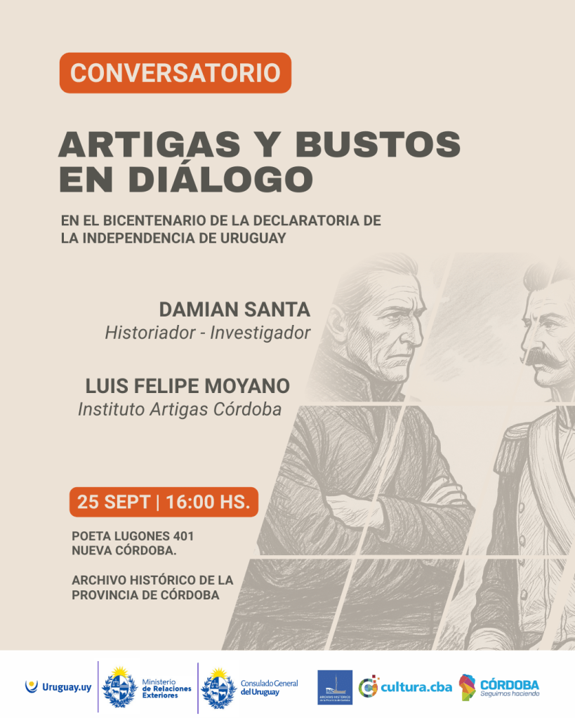 Córdoba será sede del conversatorio «Artigas y Bustos en diálogo«, organizado por la Agencia Córdoba Cultura y el Consulado General de Uruguay. La actividad se enmarca en la conmemoración del Bicentenario de la Declaratoria de la Independencia de Uruguay. El encuentro se llevará a cabo el jueves 25 de septiembre a las 16:00 horas en el Archivo Histórico de la Provincia de Córdoba, en Av. Poeta Lugones 401.