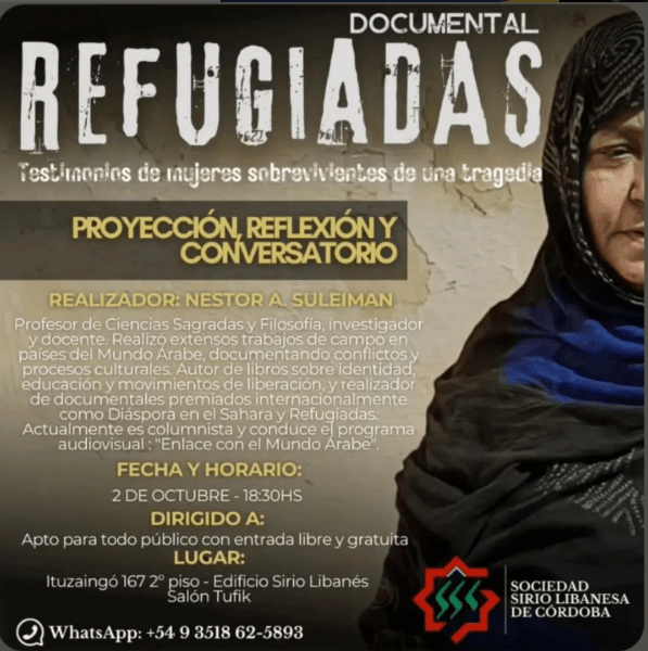 La ciudad de Córdoba será escenario de la proyección del documental «Refugiadas: Testimonios de mujeres sobrevivientes de una tragedia», un trabajo realizado por el profesor, investigador y documentalista Néstor A. Suleiman. Suleiman, conocido por sus extensos trabajos de campo sobre el mundo árabe y sus conflictos, presenta una obra que documenta experiencias humanas en situaciones de desplazamiento.