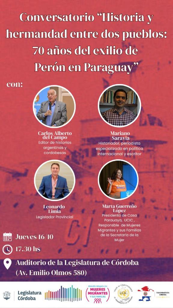 El Auditorio de la Legislatura de Córdoba (Av. Emilio Olmos 580) será sede del conversatorio “Historia y hermandad entre dos pueblos: 70 años del exilio de Perón en Paraguay”. El evento, que se realizará el jueves 16 de octubre a las 17:30 hs, tiene por objetivo ilustrar sobre la importancia del asilo político y destacar la profunda relación que une a ambas naciones.