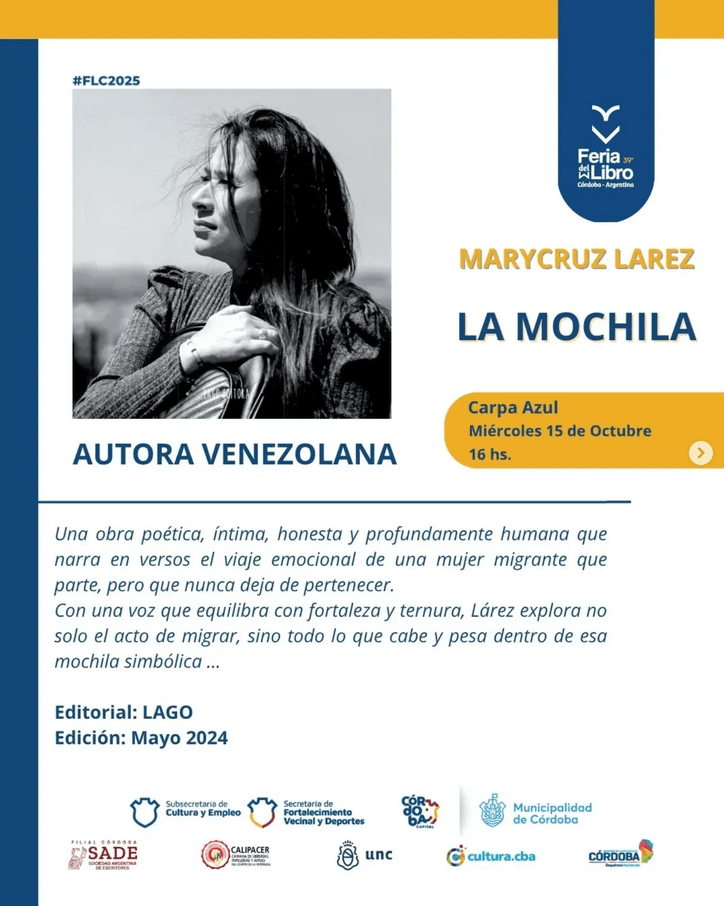 Córdoba celebra un hito en su 39° Feria del Libro con la destacada participación de Marycruz Lárez, una voz esencial del talento venezolano en Argentina. Lárez, reconocida escritora y directora de la Agrupación de Tambores Venezolanos «Macoaya» en Córdoba (miembro de FOCVA), presentará su obra poética «La Mochila».