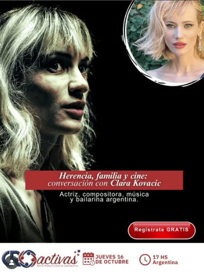 La reconocida actriz Clara Kovacic, apodada la scream queen argentina por su destacada trayectoria en el género de terror, será la protagonista de una conversación virtual sobre su carrera, su herencia familiar y el cine. El encuentro, organizado por @jeleval y @croactivas, se realizará este jueves 16 de octubre a las 17:00 hs (Argentina) a través de la plataforma Zoom y requiere registro gratuito.