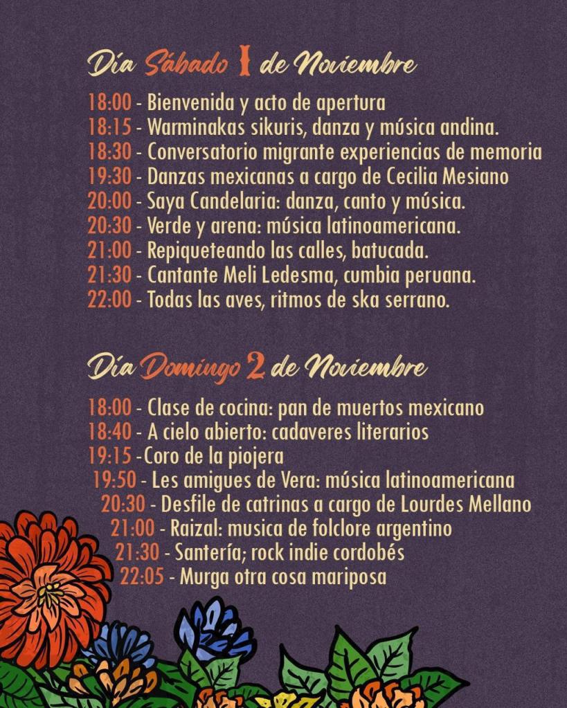 El festejo, que será libre y gratuito, se desarrollará de 18:00 a 23:00 h ambos días. La programación incluirá diversas actividades culturales como música latinoamericana y andina, danzas mexicanas, un Conversatorio Migrante, y un gran Desfile de Catrinas a cargo de Lourdes Mellano. También habrá clases de cocina, maquillaje artístico, comida y ferias barriales.