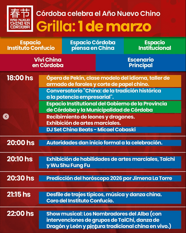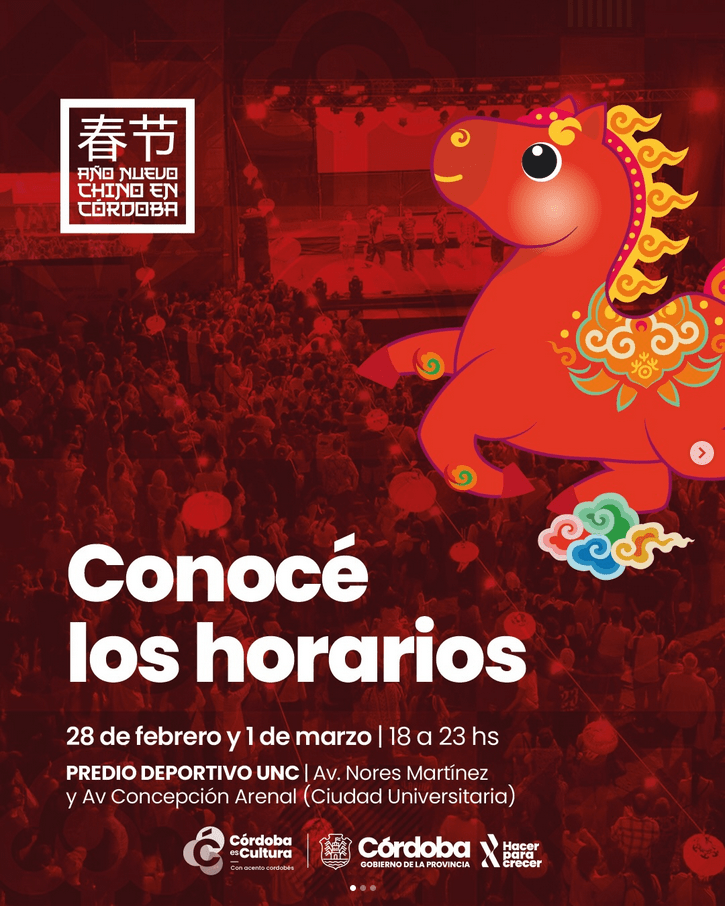La ciudad de Córdoba se prepara para vivir una nueva edición del Año Nuevo Chino los días 28 de febrero y 1 de marzo. El evento, que tendrá lugar en el Predio Deportivo de la UNC de 18:00 a 23:00 hs, ofrecerá una programación diversa distribuida en distintos espacios temáticos como el Escenario Principal, el Espacio Instituto Confucio y el Espacio Córdoba piensa en China.