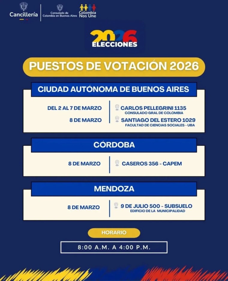 Los colombianos residentes en territorio argentino podrán ejercer su derecho al voto este 8 de marzo para renovar el Congreso de la República. El Consulado General ha dispuesto sedes estratégicas en Buenos Aires, Córdoba y Mendoza para garantizar la participación democrática.