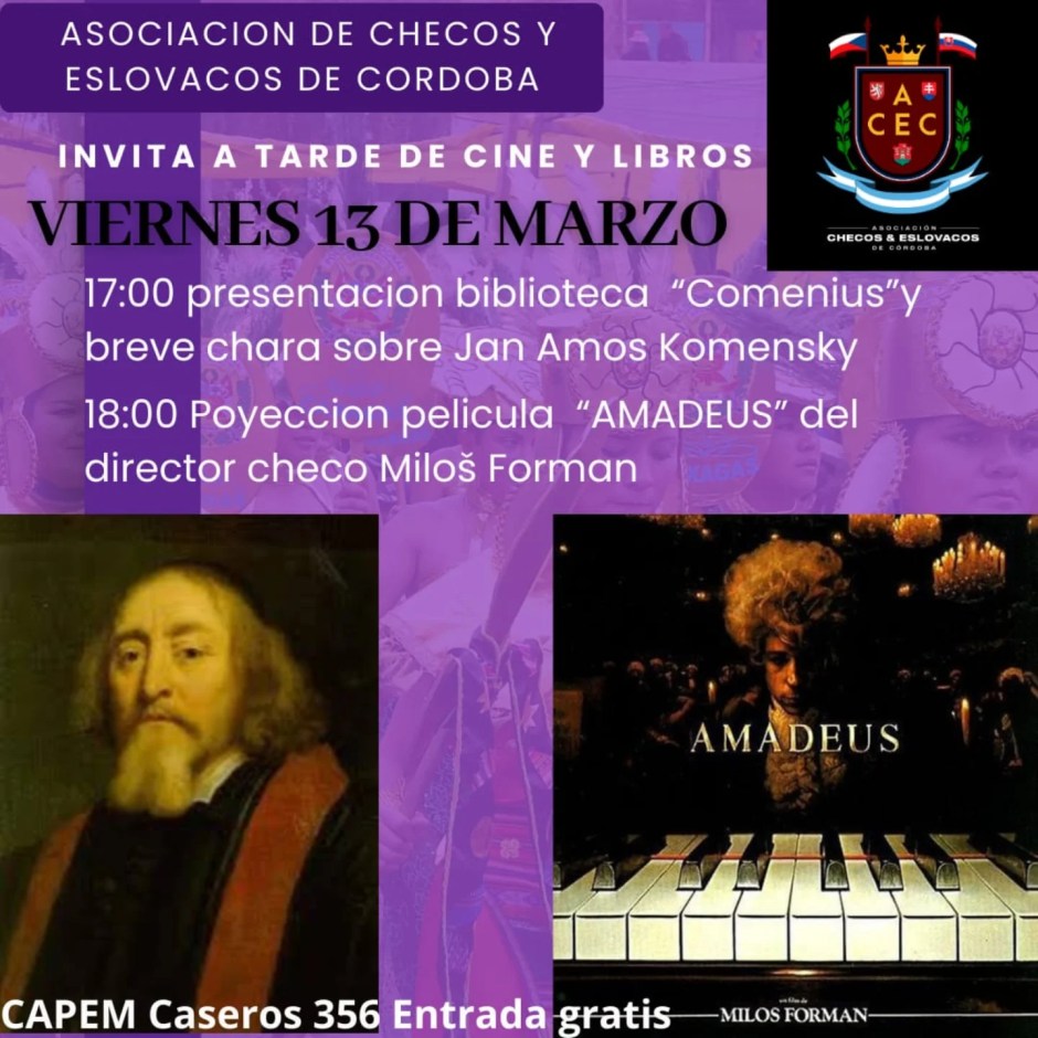 La Asociación de Checos y Eslovacos de Córdoba organiza un encuentro cultural este sábado en Caseros 356 (@Capemcba). La jornada iniciará a las 17:00 con una charla del Prof. Juan Koči sobre el escritor Jan Amos Komenský y la inauguración de la biblioteca ambulante «Comenius», donde se facilitará el préstamo de ejemplares.