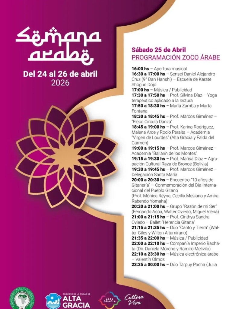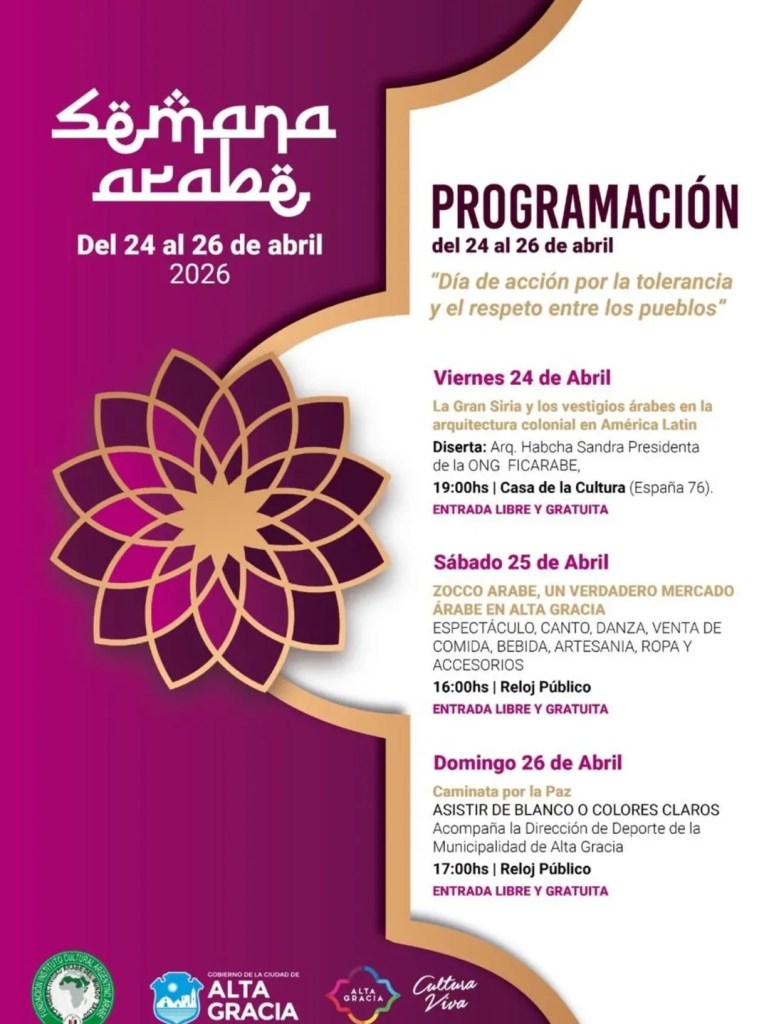 La ciudad de Alta Gracia recibirá a finales de abril una nueva edición de la «Semana Árabe», un evento que busca estrechar lazos culturales y promover el respeto entre las naciones. Con una agenda que combina lo académico, lo recreativo y lo espiritual, las actividades comenzarán el viernes 24 con una disertación de la Arq. Habcha Sandra, presidenta de la ONG FICARABE, sobre la influencia siria en la arquitectura colonial de América Latina, a las 19:00 horas en la Casa de la Cultura.