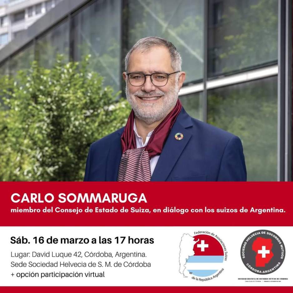 El señor Carlo Sommaruga (miembro del Consejo de los Estados de Suiza) se encontrará con la colectividad suiza de Argentina. La reunión será el día 16 de marzo a las 17 horas en la sede de la Sociedad Helvecia de S. M. de Córdoba (David Luque 42 – Barrio General Paz – Córdoba). Esta reunión tendrá formato híbrido por lo que los suizos de otras localidades podrán participar en forma remota.